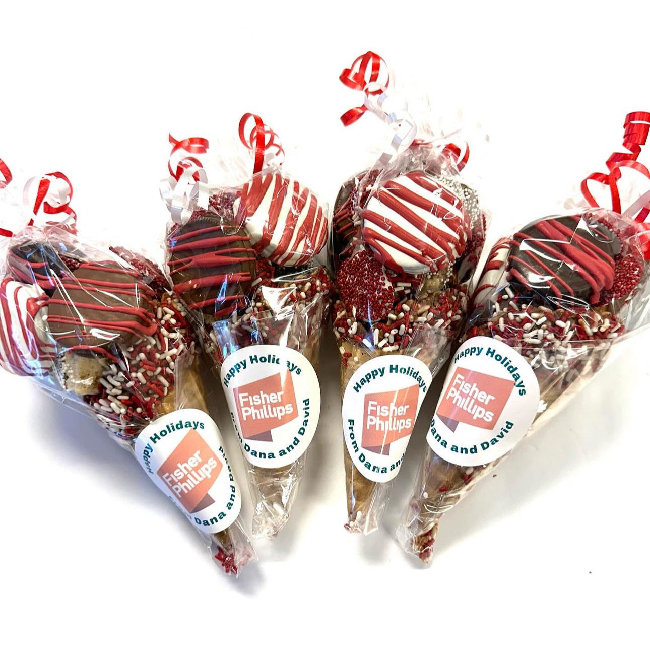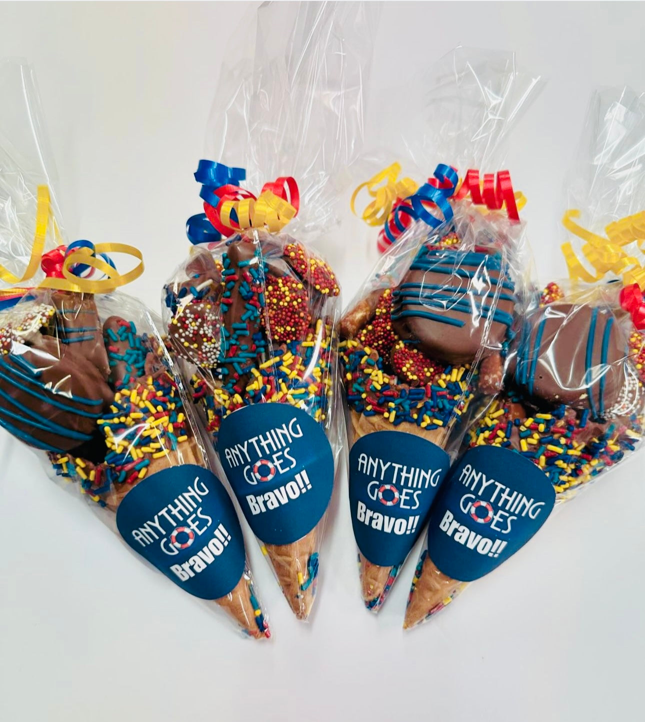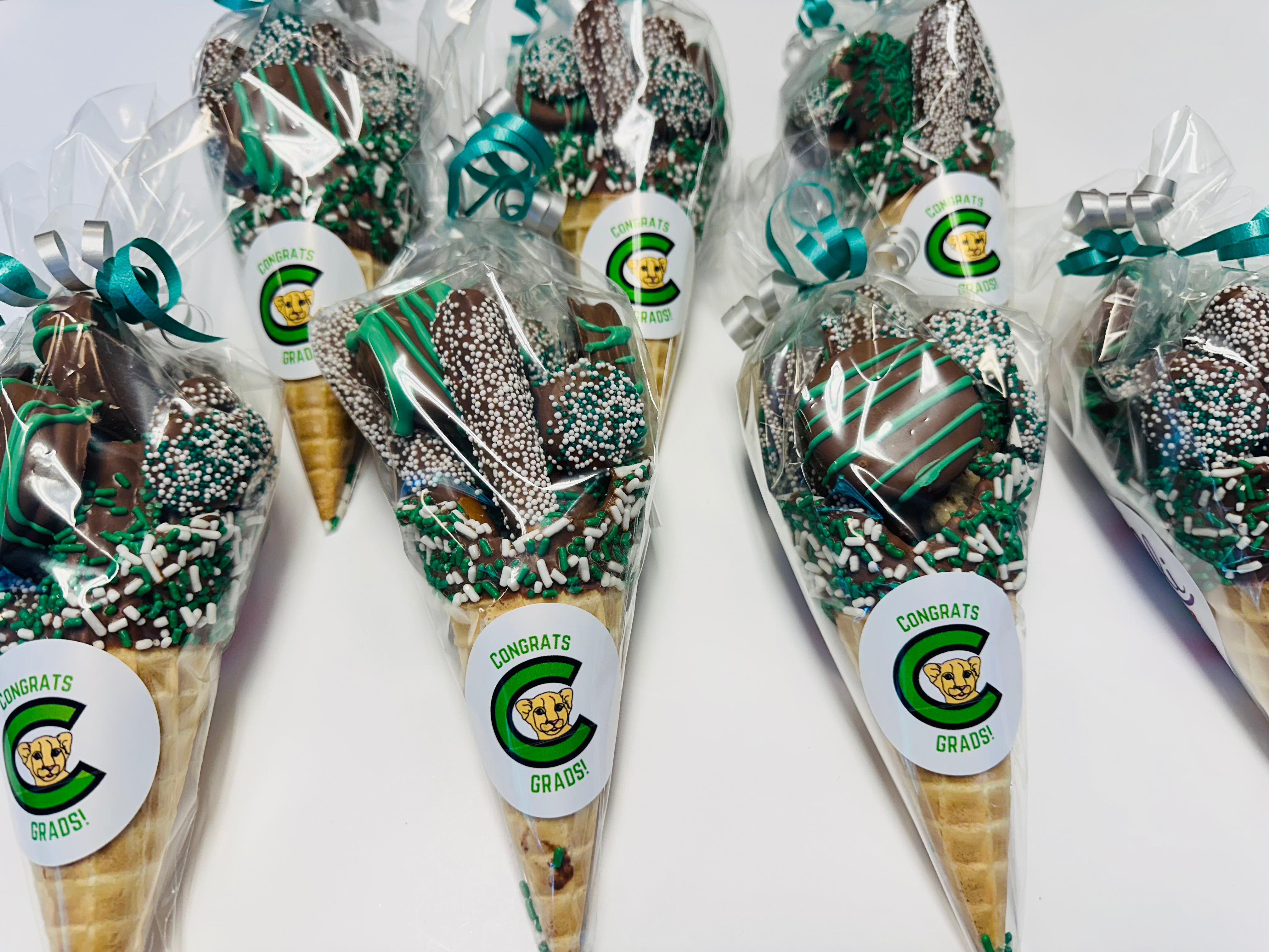 A whole bunch of your favorites (dipped oreos, pretzels, krispies and nonpariels) stuffed into a chocolate dipped waffle cone makes the ultimate party cone! Wrapped in a cello bag with a ribbon for gifiting, add an image for a custom sticker.